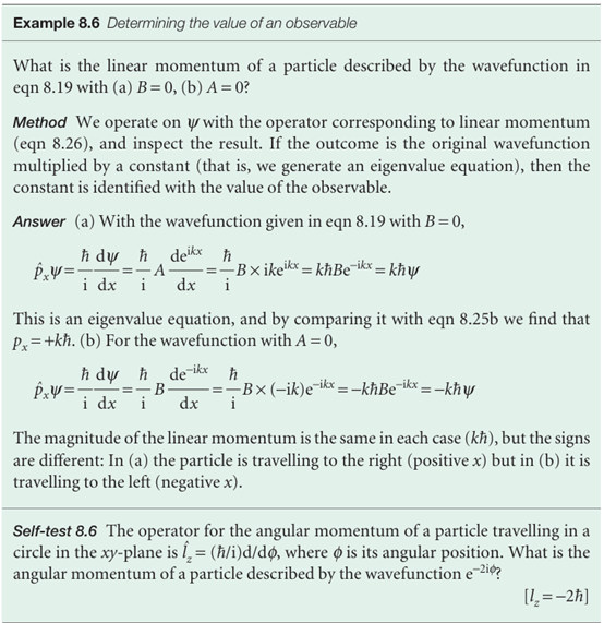 The importance of eigenvalue equations is that the pattern (Energy operator) ψ = (energy) × ψ , exemplified by the Schrödinger equation is repeated for other observables, or measur-able properties of a system, such as the momentum or the electric dipole moment. Thus, it is often the case that we can write , (Operator corresponding to an observable)ψ = (value of observable) × ψ , The symbol Ω in eqn 8.25b is then interpreted as an operator (for example, the hamiltonian, H) corresponding to an observable (for example, the energy), and the eigenvalue ω is the value of that observable (for example, the value of the energy, E). Therefore, if we know both the wavefunction ψ and the operator Ω corresponding to the observable Ω of interest, and the wavefunction is an eigenfunction of the operator Ω, then we can predict the outcome of an observation of the property Ω (for example, an atom’s energy) by picking out the factor ω in the eigenvalue equation, eqn 8.25b.