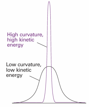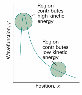 Fig. 8.27The observed kinetic energy of a particle is an average of contributions from the entire space covered by the wavefunction. Sharply curved regions contribute a high kinetic energy to the average; slightly curved regions contribute only a small kinetic energy.