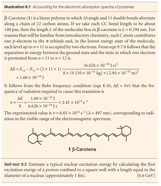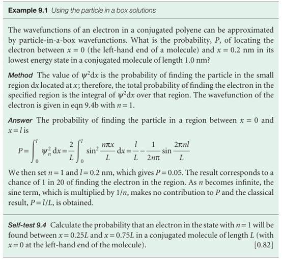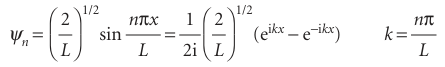 Figure 9.3 shows some of the wavefunctions of a particle in a box: they are all sine functions with the same amplitude but different wavelengths. Shortening the wave length results in a sharper average curvature of the wavefunction and therefore an increase in the kinetic energy of the particle. Note that the number of nodes (points where the wavefunction passes through zero) also increases as nincreases, and that the wavefunctionψnhasn−1 nodes. Increasing the number of nodes between walls of a given separation increases the average curvature of the wavefunction and hence the kinetic energy of the particle. The linear momentum of a particle in a box is not well defined because the wave function sin kxis a standing wave and, like the example of cos kxtreated in Section 8.5d, not an eigenfunction of the linear momentum operator. However, each wave function is a superposition of momentum eigenfunctions: