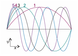 Fig. 9.3The first five normalized wavefunctions of a particle in a box. Each wavefunction is a standing wave, and successive functions possess one more half wave and a correspondingly shorter wavelength.