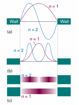 Fig. 9.4 (a) The first two wavefunctions, (b) the corresponding probability distributions, and (c) a representation of the probability distribution in terms of the darkness of shading.