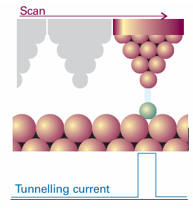 Fig. 9.16 A scanning tunnelling microscope makes use of the current of electrons that tunnel between the surface and the tip. That current is very sensitive to the distance of the tip above the surface.