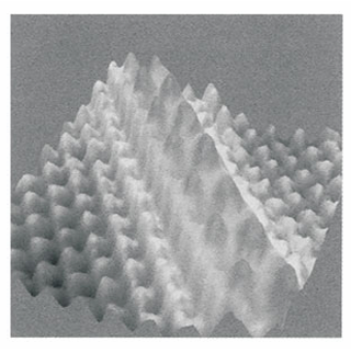 Nanoscience is the study of atomic and molecular assemblies with dimensions ranging from 1 nm to about 100 nm and nanotechnology is concerned with the incorporation of such assemblies into devices. The future economic impact of nanotechnology could be very significant. For example, increased demand for very small digital electronic devices has driven the design of ever smaller and more powerful microprocessors. However, there is an upper limit on the density of electronic circuits that can be incorporated into silicon-based chips with current fabrication technologies. As the ability to process data increases with the number of circuits in a chip, it follows that soon chips and the devices that use them will have to become bigger if processing power is to increase indefinitely. One way to circumvent this problem is to fabricate devices from nanometre-sized components. We will explore several concepts of nanoscience throughout the text. We begin with the description of scanning probe microscopy (SPM), a collection of techniques that can be used to visualize and manipulate objects as small as atoms on surfaces. Consequently, SPM has far better resolution than electron microscopy (Impact I8.1). One modality of SPM is scanning tunnelling microscopy (STM), in which a platinum rhodium or tungsten needle is scanned across the surface of a conducting solid. When the tip of the needle is brought very close to the surface, electrons tunnel across the intervening space (Fig. 9.16). In the constant-current mode of operation, the stylus moves up and down corresponding to the form of the surface, and the topography of the surface, including any adsorbates, can be mapped on an atomic scale. The vertical motion of the stylus is achieved by fixing it to a piezoelectric cylinder, which contracts or expands according to the potential difference it experiences. In the constant-z mode, the vertical position of the stylus is held constant and the current is monitored. Because the tunnelling probability is very sensitive to the size of the gap, the micro scope can detect tiny, atom-scale variations in the height of the surface. Figure 9.17 shows an example of the kind of image obtained with a surface, in this case of gallium arsenide, that has been modified by addition of atoms, in this case caesium atoms. Each ‘bump’ on the surface corresponds to an atom. In a further variation of the STM technique, the tip may be used to nudge single atoms around on the surface, making possible the fabrication of complex and yet very tiny nanometre sized structures. In atomic force microscopy (AFM) a sharpened stylus attached to a cantilever is scanned across the surface. The force exerted by the surface and any bound species pushes or pulls on the stylus and deflects the cantilever (Fig. 9.18). The deflection is monitored either by interferometry or by using a laser beam. Because no current is needed between the sample and the probe, the technique can be applied to non-conducting surfaces too. A spectacular demonstration of the power of AFM is given in Fig. 9.19, which shows individual DNA molecules on a solid surface.