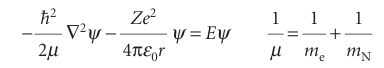 where differentiation is now with respect to the coordinates of the electron relative to the nucleus. The quantity µ is called the reduced mass. The reduced mass is very similar to the electron mass because mN, the mass of the nucleus, is much larger than the mass of an electron, so 1/µ ≈ 1/me. In all except the most precise work, the reduced mass can be replaced by me. Because the potential energy is centrosymmetric (independent of angle), we can suspect that the equation is separable into radial and angular components. Therefore, we write
