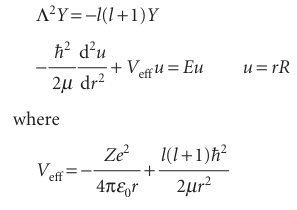 Equation 10.8 is the same as the Schrödinger equation for a particle free to move round a central point, and we considered it in Section 9.7. The solutions are the spherical harmonics (Table 9.3), and are specified by the quantum numbers l and ml. We consider them in more detail shortly. Equation 10.9 is called the radial wave equation. The radial wave equation is the description of the motion of a particle of mass µin a one-dimensional region 0 ≤ r<∞where the potential energy is V eff.