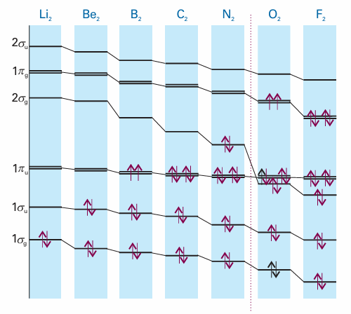 Fig. 11.32 The variation of the orbital energies of Period 2 homonuclear diatomics.