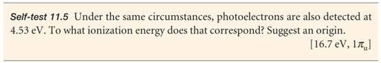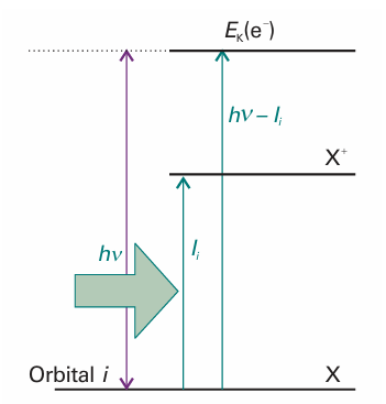 This equation (which is like the one used for the photoelectric effect, Section 8.2a) can be refined in two ways. First, photoelectrons may originate from one of a number of different orbitals, and each one has a different ionization energy. Hence, a series of different kinetic energies of the photoelectrons will be obtained, each one satisfying