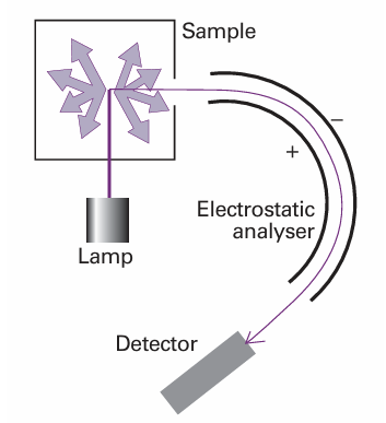 Fig. 11.35 A photoelectron spectrometer consists of a source of ionizing radiation (such as a helium discharge lamp for UPS and an X-ray source for XPS), an electrostatic analyser, and an electron detector. The deflection of the electron path caused by the analyser depends on their speed.