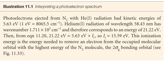 So far we have treated molecular orbitals as purely theoretical constructs, but is there experimental evidence for their existence? Photoelectron spectroscopy (PES) measures the ionization energies of molecules when electrons are ejected from different orbitals by absorption of a photon of the proper energy, and uses the information to infer the energies of molecular orbitals. The technique is also used to study solids, and in Chapter 25 we shall see the important information that it gives about species at or on surfaces. Because energy is conserved when a photon ionizes a sample, the energy of the incident photon hν must be equal to the sum of the ionization energy, I, of the sample and the kinetic energy of the photoelectron, the ejected electron (Fig. 11.34):
