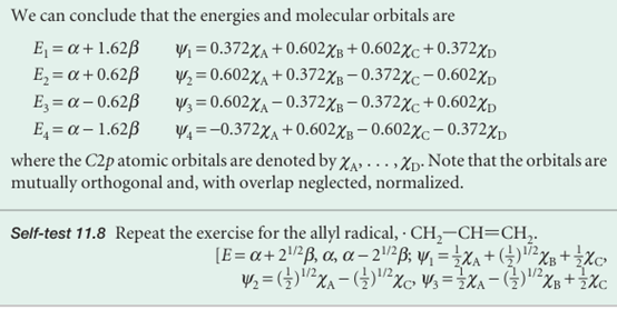As we saw in the preceding example, the energies of the four LCAO-MOs for butadiene are , E=α±1.62β, α±0.62β , These orbitals and their energies are drawn in Fig. 11.39. Note that the greater the number of internuclear nodes, the higher the energy of the orbital. There are four electrons to accommodate, so the ground-state configuration is 1π2 2π2. The frontier orbitals of butadiene are the 2π orbital (the HOMO, which is largely bonding) and the 3πorbital (the LUMO, which is largely antibonding). ‘Largely’ bonding means that an orbital has both bonding and antibonding interactions between various neighbours, but the bonding effects dominate. ‘Largely antibonding’ indicates that the antibonding effects dominate.