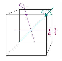 Fig. 12.1 Some of the symmetry elements of a cube. The twofold, threefold, and fourfold axes are labelled with the conventional symbols.