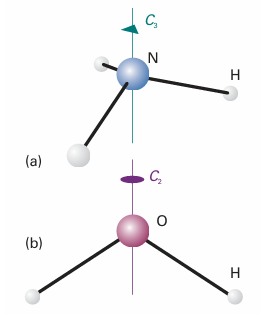 Fig. 12.2 (a) An NH3 molecule has a threefold (C3) axis and (b) an H2O molecule has a twofold (C2) axis. Both have other symmetry elements too.