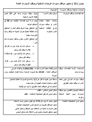 يجب ان تكون للوحدات السكنية ولأبنية المرافق العامة مواقف سيارات خاصة بها. تخضع مواقف السيارات لما يلي: