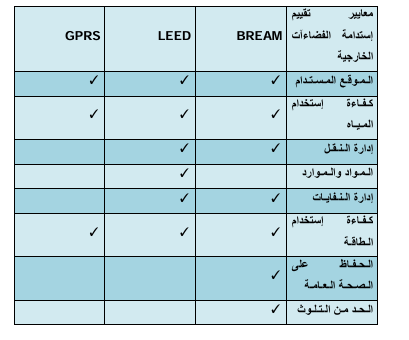 مقارنة معايير تقييم استدامة الفضاءات الخارجية لأنظمة BREAM و GPRS, LEED