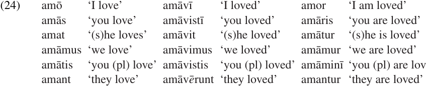 Another type of language is the SYNTHETIC type (also referred to as FUSIONAL or INFLECTIONAL languages). In languages of this type, a single affix frequently marks several grammatical categories at once. Such affixes are sometimes called PORTMANTEAU MORPHEMES.3 A well-known example involves the Latin verbal suffixes, a small number of which are illustrated in (24).