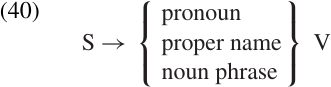 But notice that the material inside the braces in (42) is exactly the same as in (40). Moreover, the same set of alternatives will show up in many other Phrase Structure rules as well. In almost every position where a name can occur, we can substitute a pronoun or a common noun phrase. If we had to list all of these alternatives in every rule that mentions one of these positions, there would be a large amount of redundancy in the rules. We would obviously be missing an important generalization.