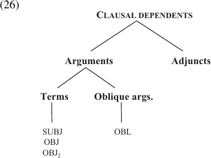 We have identified two basic classes of Grammatical Relations, obliques vs. terms (or direct arguments). These two classes are distinguished on the basis of grammatical properties. Terms (i.e. SUBJ, OBJ, OBJ2) play an active role in a wide variety of syntactic constructions, while obliques are relatively inert. This classification of clausal elements is summarized in the following diagram: