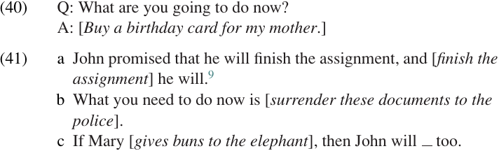 The evidence which supports a VP constituent for English is fairly complex, and we will not consider it in detail here.8 A few of the relevant patterns are illustrated in (40–41). These examples show that the combination of V +OBJ (+ OBL) can function as a sentence fragment in answer to a question (40), and can be re-ordered or deleted as a unit (41). These are some of the classic tests for constituency.