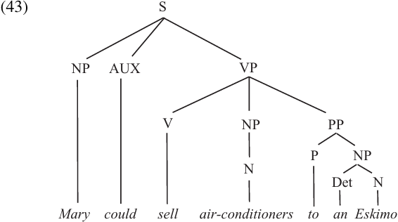 Based on these assumptions, we would assign the structure shown in (43) to a basic clause like Mary could sell air-conditioners to an Eskimo.