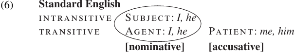 As these examples illustrate, subject pronouns have the same form (I and he) whether the clause is intransitive, as in (5a, b), or transitive, as in (5c, d). Following standard terminology, we would call this the nominative form.