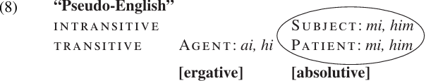 In these examples, we see that direct objects of transitive clauses take the same form as subjects of intransitive clauses, namely mi or him. Subjects of transitive clauses take a special form, ai or hi. This kind of case-marking pattern, summarized in (8), is referred to as an ERGATIVE system. The form used for transitive subjects is called ERGATIVE case, while the form used for transitive objects and intransitive subjects is called ABSOLUTIVE case.