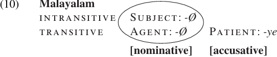 Based on the examples in (1), how should we classify the case-marking pattern of Malayalam? We can see that subjects get the same marking (namely-Ø) whether the clause is intransitive, as in (1a, b), transitive, as in (1c-e), or ditransitive, as in (1f-h). Direct objects get a special case marker (-ye) which is distinct from the marking for subjects. This distribution, which is summarized in (10), clearly fits the Nominative–Accusative pattern.