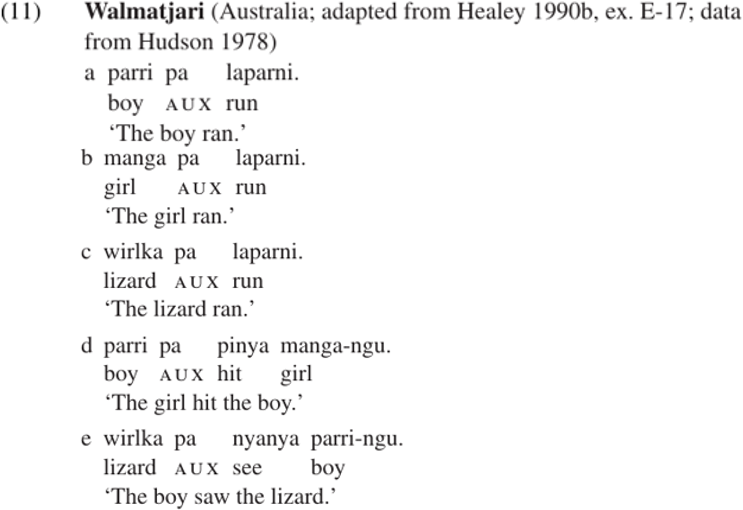 The Malayalam and Walmatjari data illustrate an interesting fact about case systems. If a language has an “unmarked” case, or zero case marker, it is most likely to be the case that is used for intransitive subjects: the nominative in an accusative language like Malayalam, and the absolutive in an ergative language like Walmatjari.1