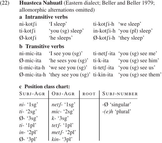 Nahuatl (or Aztec), from Mexico, is a language in which a transitive verb agrees with both subject and direct object, as illustrated in (22b). An intransitive verb, of course, agrees only with the subject (22a). Notice that, in addition to the agreement prefixes which register the person and number of the subject and object, the verb also bears a plural agreement suffix-(e)h when the subject is plural. The agreement affixes are summarized in the chart in (22c).