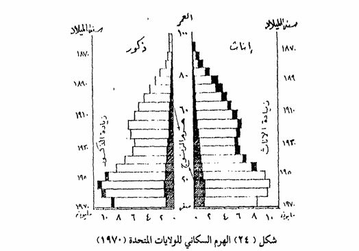 يظهر من الهرم السكاني للولايات المتحدة عام 1970 كيف أن انخفاض معدلات المواليد يؤثر فى كل من الزنوج والبيض معا، نظرا لأن القاعدة في الهرم أقل من الفئات التي تليها لدى كل من الزنوج والبيض معا ، كما أن زيادة الذكور تظهر في فئات السن الدنيا فقط ( المعالين الصغار) ولكنها تختفى لتحل محلها زيادة الإناث بانتظام فى كل فئات الهرم كما يظهر في الهرم أيضا أثر أزمة الثلاثينات فى انخفاض معدلات المواليد والهجرة معا لأن فئات المواليد في فترة أزمة الكساد العلمي أقل من فئات المواليد قبل الأزمة أو بعدها، وأن كان ذلك يظهر في هرم السكان البيض بدرجة أوضح منه في الجزء الخاص بالزنوج فى الهرم ، كما يظهر أخيرا من هذا الهرم أن السكان البيض أعلى في متوسطات أعمارهم من الزنوج وأنه على حين تكون نسبة الإناث في فئات العمر الكبيرة أعلي من فئات الذكور سواء بالنسبة للبيض أو الزنوج أكثر من 80 عاما الذين لا يظهر بينهم رجال فى الهرم على حين تبقى بعض النساء في هرم الزنوج إلى 95 عاما، وفوق هذه الفئة تختفي النساء تقريبا ويصبح الذكور البيض فقط هم الذين يظهرون في فئة العمر 95-100 عام.