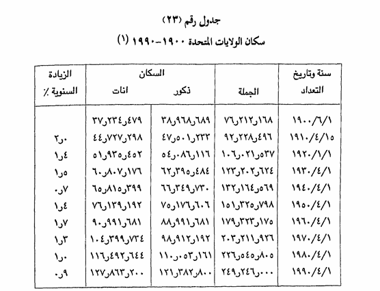 ويلخص الجدول رقم (23) إجمالي سكان الولايات المتحدة في التعدادات العشرة الأخيرة.