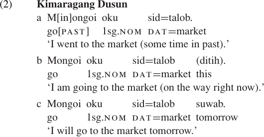 The most common morphological tense systems involve a two-way distinction: either past vs. non-past, or future vs. non-future. We noted above that English has just two morphological tenses, past and non-past. Kimaragang Dusun has a similar system: the infix–in–is used to express actions in the past (2a), but not for actions in the present (2b) or future (2c).1