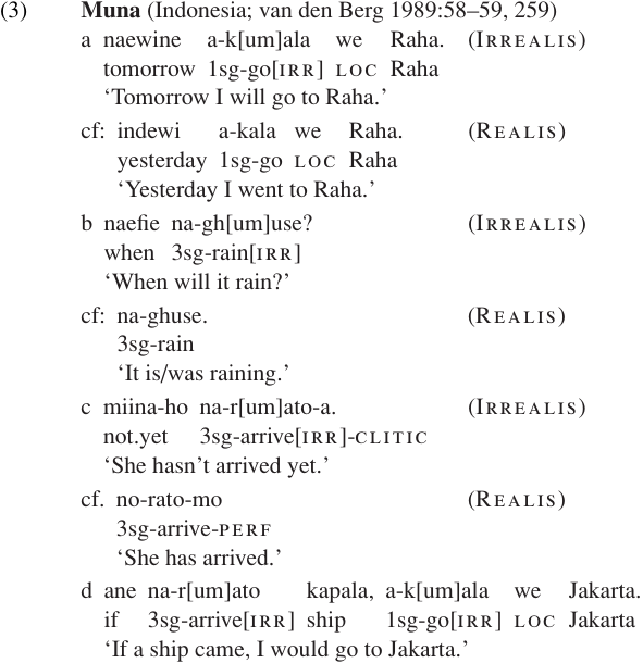 The Muna language of Sulawesi, Indonesia, provides a good example. Realis (non-future) tense is unmarked, while irrealis (future) tense is marked by the infix-um-and/ or a change in the form of the subject agreement prefix. Irrealis is used for future events (3a,b); it is obligatory in negated clauses (3c); and it occurs in many conditional clauses (3d).