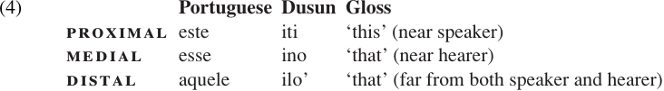While tense systems involving two morphological tenses are the most common, a number of languages distinguish more than three tense categories. Let us return briefly to our analogy between tense and spatial location. Spatial deictics in virtually all languages distinguish between things which are near the speaker and things which are far from the speaker (this/that, here/there, etc.). However, many languages allow more than two choices. For example, demonstratives in Portuguese and Dusun distinguish three degrees of distance from speaker (or PROXIMITY).