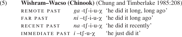 Similarly, the tense systems of some languages distinguish various degrees of distance in the past or future. The Wishram–Wacso dialect of Chinook has four distinct past tenses: