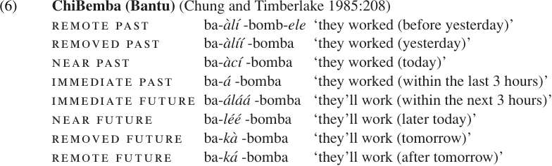 In this language the boundaries between the various categories are rather vague, but recent past is the most likely choice for something which happened in the past week, while far past could be used for events which took place during the past several months at least. Some other languages have very specific cut-off points such as ‘today’ vs. ‘yesterday,’ ‘yesterday’ vs. ‘before yesterday,’ etc. A beautiful example is found in the Bantu language ChiBemba, which has (in addition to the present tense, illustrated in (37) below) a symmetric set of four past and four future tenses.