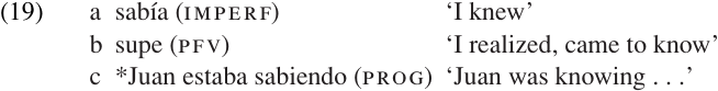 Inherently stative predicates may be more naturally expressed in the imperfective. The normal way to express the past tense of the Spanish verb meaning ‘to know’ is in the imperfective, as in (16b, c) and (19a). The perfective aspect (19b) would give the predicate an eventive meaning, in this case ‘came to know.’ As noted above, states cannot normally be expressed in the progressive (19c).