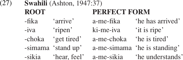 Comrie identifies four major uses of the perfect: (a) perfect of result; (b) experiential perfect; (c) perfect of persistent situation; (d) perfect of recent past. The term “perfect of result” means that a perfect verb is used to describe a result state. For example, if I say The governor has arrived my hearers can normally assume that the governor is here right now. Ashton (1947:37) points out that the Swahili perfect may be used to express either completion of the action or the state resulting from the action. In the latter case (the perfect of result), it is often best translated into English using the verb to be or some other stative predicate (e.g. understand).