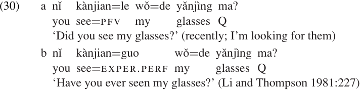 Mandarin Chinese has a specific particle, guo, which is used to mark the experiential perfect. This is illustrated in (30b), in contrast to the perfective construction in (30a). Similarly, Malay has a specific auxiliary verb pernah which is only used to express the experiential perfect.