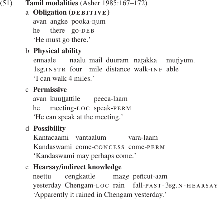 Tamil (a Dravidian language of southern India) has a fairly complex system of moods and modalities, involving both inflectional suffixes and modal verbs. Some of the modalities are illustrated in (51). Note that the suffix-laam, which marks a kind of hortative mood, is also used for the modalities of permission and possibility. It is glossed as “PERM” (for ‘permissive’) in these examples.