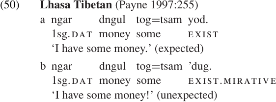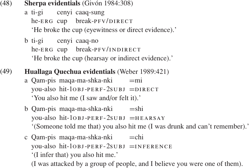 Many languages have some means of indicating the speaker’s basis for asserting the proposition, i.e. how the knowledge was acquired. Common distinctions in this area include direct knowledge (eye-witness report) vs. hearsay vs. inference; some examples are presented in (48–49).