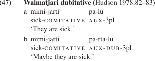 Turning to speaker-oriented modality, some languages have a special DUBITATIVE marker, which indicates that the speaker has some doubt about the truth of the proposition expressed.