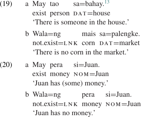 The existential predicates in (19–20) do not fit neatly into any syntactic category. Verbs in Tagalog take a rich assortment of inflectional and derivational affixes, but the existential may (or the longer form, mayroon) cannot take any of these affixes.14 On the other hand, existential may does not share the properties of any other lexical category either. (Such forms are found in many languages; often they are called DEFECTIVE verbs, meaning that they lack the normal range of inflected forms which most verbs in the language exhibit.) So it is difficult to say whether the existential constructions above are strictly speaking “non-verbal” clauses; but they are clearly different from normal verbal clauses.