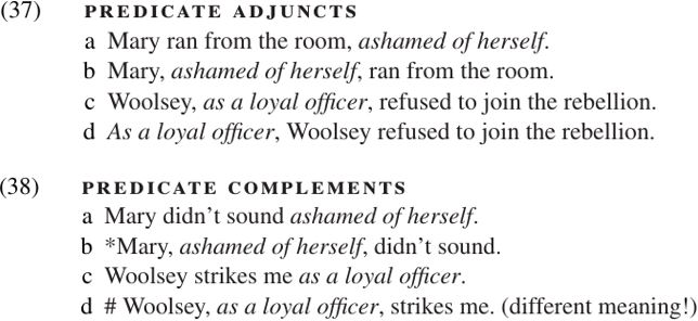 Bresnan (2001:267ff.) presents several other kinds of evidence demonstrating the difference between predicate complements and predicate adjuncts. We will mention two of these briefly. First, adjuncts can often occur in a variety of positions within the sentence, as illustrated in (37); but the position of predicate complements is relatively fixed, as illustrated in (38).