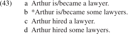 Number agreement proves to be more useful than case marking in English: as (43) shows, predicate complements must agree with the subject NP for number, but there is no such restriction on objects.