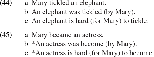 Another kind of evidence comes from the fact that predicate complement NPs cannot appear in certain constructions where direct objects can. For example, an object NP can become the subject of a passive sentence (44b) or of certain adjectives (like hard, easy, etc.) which require a verbal or clausal complement (44c). However, predicate complement NPs never occur in these positions, as illustrated in (45).