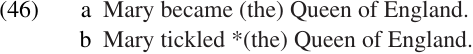 Finally, the definite article is often optional in predicate complement NPs, but not in object NPs; this is illustrated in (46). Thus, we have very strong evidence for distinguishing between NPs that function as objects and those that function as predicate complements.