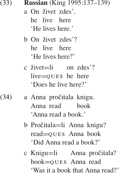 Yes–No questions in Russian may be formed either by the use of question intonation alone, as in (33b), or by the use of a clitic particle =li, as in (33c). The element which hosts the clitic appears in sentence-initial position. As in Quechua, the clitic may attach either to the verb or to some other element of the sentence. If the clitic attaches to the verb, as in (33c) and (34b), the entire proposition is being questioned. If the clitic attaches to another element, as in (34c), that element becomes the focus of the question.