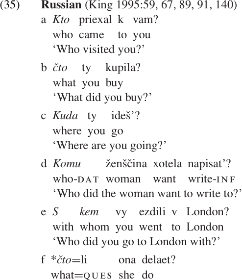 Question words in Russian content questions always occur in initial position. The interrogative clitic =li may not co-occur with a question word (35f).