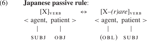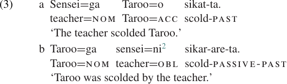 Clearly the two sentences are quite similar. Their meaning is essentially the same, in the sense that they describe the same kind of event, and it would be impossible for one to be true while the other is false. The word order is essentially the same: in both cases the subject (marked with nominative case) comes first, and the verb comes last. In fact, there seem to be only two significant differences. First, the verb in (3b) contains an additional morpheme, the suffix-(r) are, which does not occur in (3a). Second, while the same participants bear the same semantic roles in both sentences, there is a shift in the assignment of Grammatical Relations. The patient Taroo is the direct object in(3a), but the subject in(3b); the agent sensei is the subject in (3a), but an oblique argument in (3b).