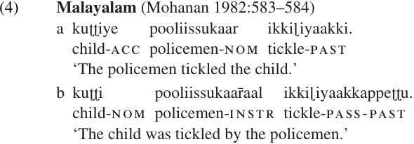The pair of Malayalam sentences in (4) illustrates the same kind of alternation. We have already seen that word order in Malayalam is quite free, provided the verb comes last. In both of these sentences the patient occurs before the agent, but once again the change in case marking indicates a change in the Grammatical Relations: the patient is the OBJ in (4a) and the SUBJ in (4b).